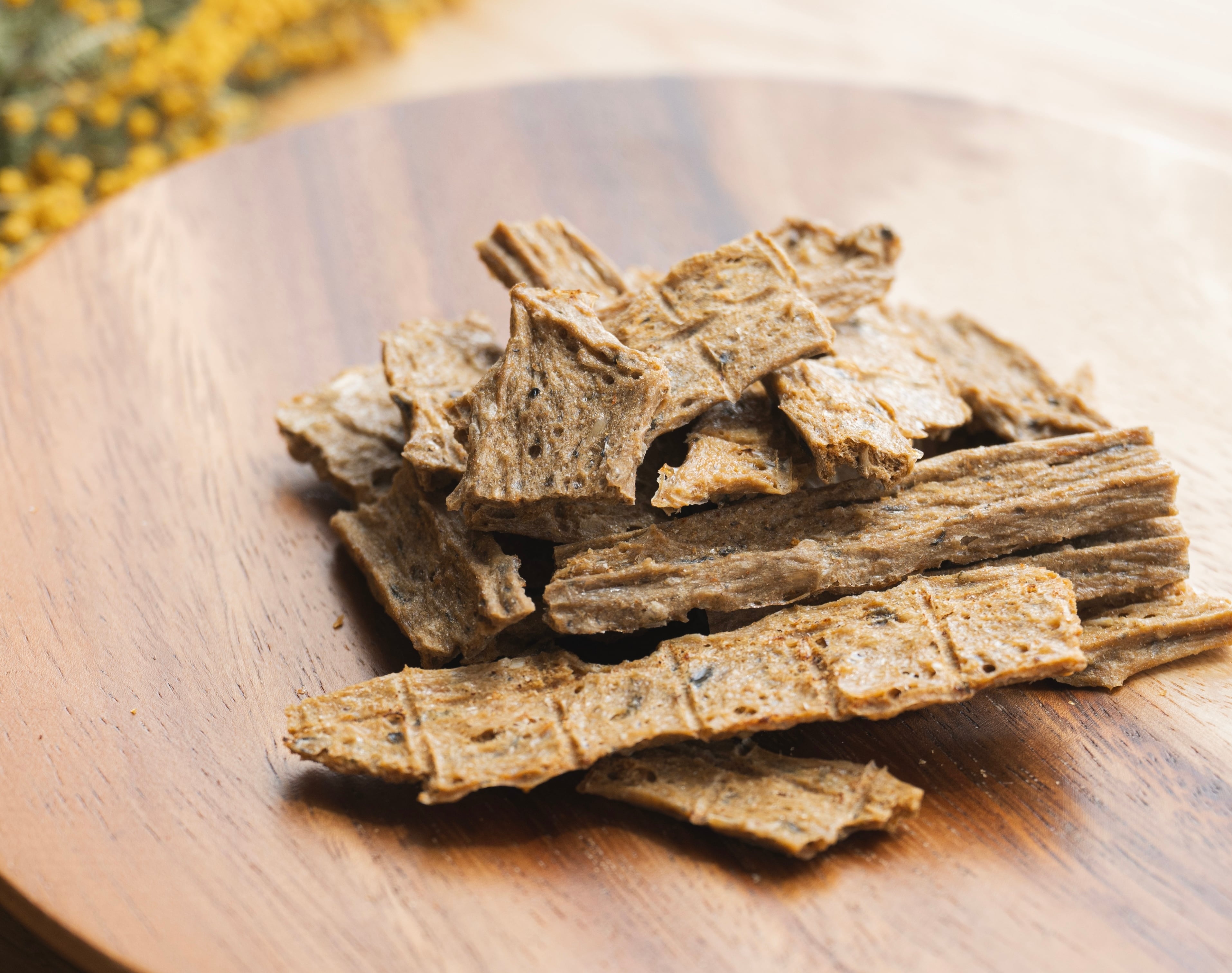 低脂肪、高蛋白でビタミン・ミネラル、DHAやEPAなどオメガ3脂肪酸、筋肉を増やすのに重要なアミノ酸であるBCAA(バリン、ロイシン、イソロイシン)を豊富に含み、ワンちゃんの健康を促進することが期待できる食材で作った安心の無添加おやつです。
